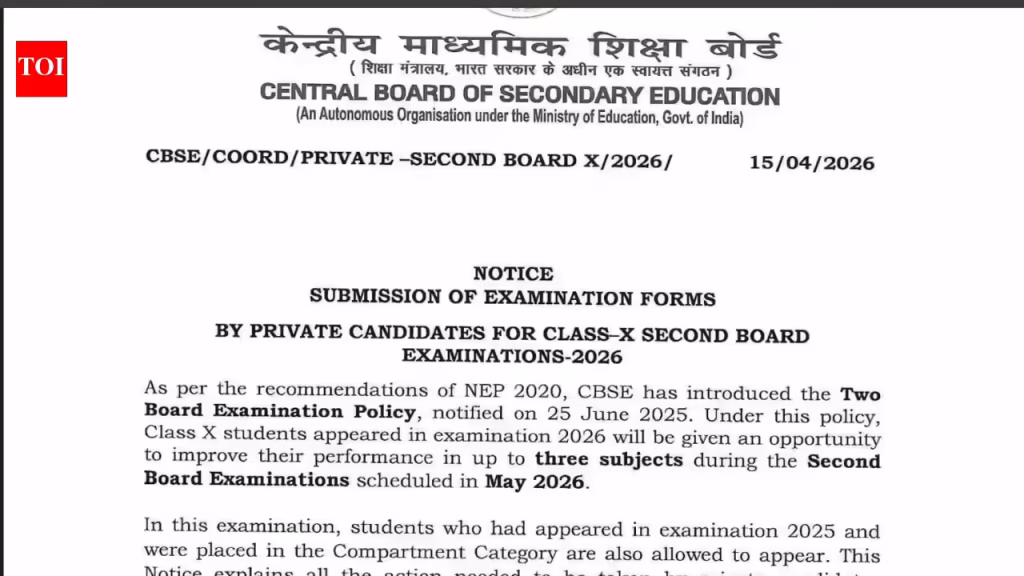 CBSE’s second board exam 2026 for Class 10 private candidates under new two-exam policy: Check how to apply and other key details here – The Times of India