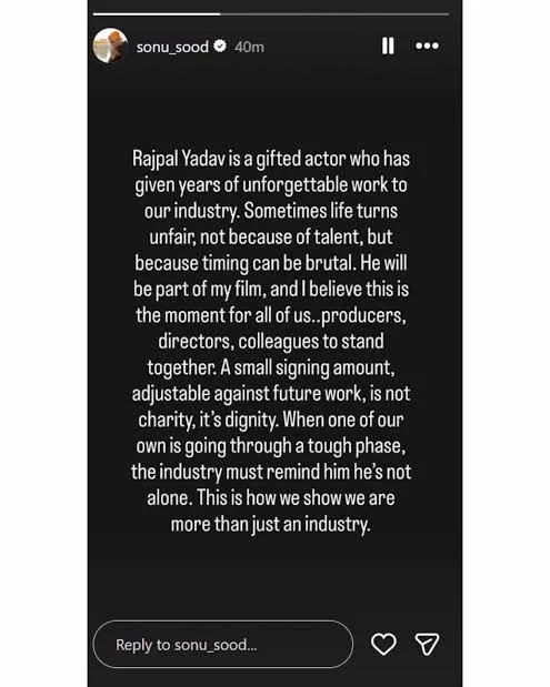 In his tweet, Sonu wrote, “Rajpal Yadav is a talented actor who has given our industry memorable roles over the years. Sometimes life is unfair, not because of talent, but because of bad timing. He will be a part of my film, and I believe it’s time for all of us, producers, directors, and colleagues to unite.” Calling for collective responsibility, Sonu added that offering financial help in exchange for future work should not be seen as charity but as respect.