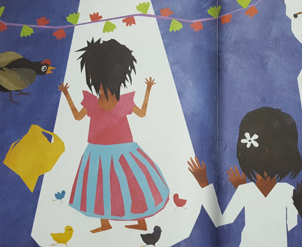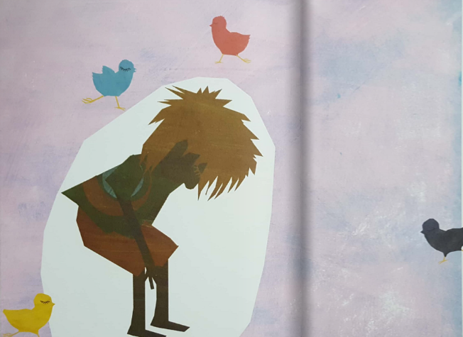 In addition to the irregular paintbrush strokes and cutouts, the colour palette also aligns with Guthli’s fluctuating moods throughout the story. When she retreats into herself, Guthli’s entire physical form becomes dark and unclear to decipher, unlike her previous and later, more colourful illustrations. When Guthli’s mother finally accepts her for who she is, the colour palette becomes traditionally feminine, thereby aligning with established societal norms in which certain colours are associated with certain genders – girls like pink and boys like blue.