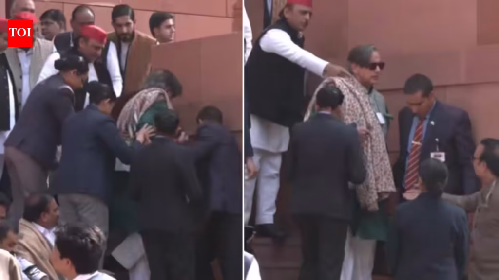 Shashi Tharoor trips and falls at Parliament stairs; Akhilesh Yadav helps – video | India News – The Times of India