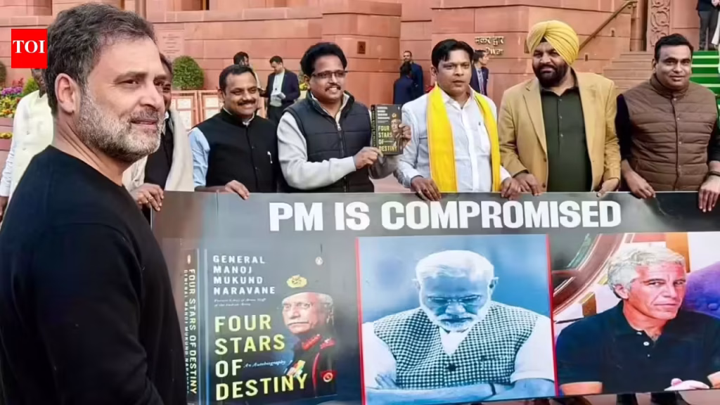 The Speaker urged members to maintain dignity of the House and slammed the opposition for displaying banners and posters. The House was then adjourned till 2 pm. Later, the House was adjourned till 5 pm following an uproar over Dubey’s remarks targeting the Gandhi family. It was adjourned for the day by Rai.Scared Modi ran away from House, claim oppn MPsAfter the PM’s no-show in Lok Sabha, Rahul Gandhi said Narendra Modi feared being gifted General M M Naravane’s memoirs that narrate his account as Army chief during the 2020 Chinese aggression.Rahul remarked, “As I had said, PM will not come to LS because he does not want to face the truth.”Earlier Wednesday, Rahul dramatically posed in the Parliament complex with Naravane’s book “Four Stars to Destiny” that he was not allowed to cite in his speech on the motion of thanks to the President’s address, telling reporters, “I don’t think the PM will have the guts to come to LS today. If he comes, I will give him this book so that… he knows his reality.”After three days of logjam, the anti-BJP camp was excited that the PM had to back down from his scheduled speech for fear of disruptions. After the abrupt end to the evening’s proceedings, Trinamool Congress’ Kalyan Banerjee said, “He ran away for fear of the opposition.”Congress MP K C Venugopal said govt was making a mockery of Parliament, and the PM should be asked why he did not come for his speech. Congress MP Manickam Tagore said since the LOP was not allowed to speak in LS, the PM’s address too had to be cancelled. “This is the first time in parliamentary history… The united voice of 239 MPs will make India stronger,” he said.Priyanka Gandhi Vadra also said Modi was too scared to come to the House. “The rail minister and Nishikant Dubey ran away like a bullet train,” she mocked.Quoting from the book to reporters, Rahul alleged Modi had abdicated responsibility during the Ladakh crisis. He said Naravane has said that he felt abandoned. He said the govt was now trying to deny the very existence of the book despite it being in the public domain.Rahul added that every young Indian should read the retired General’s detailed first-hand account of events in Ladakh.